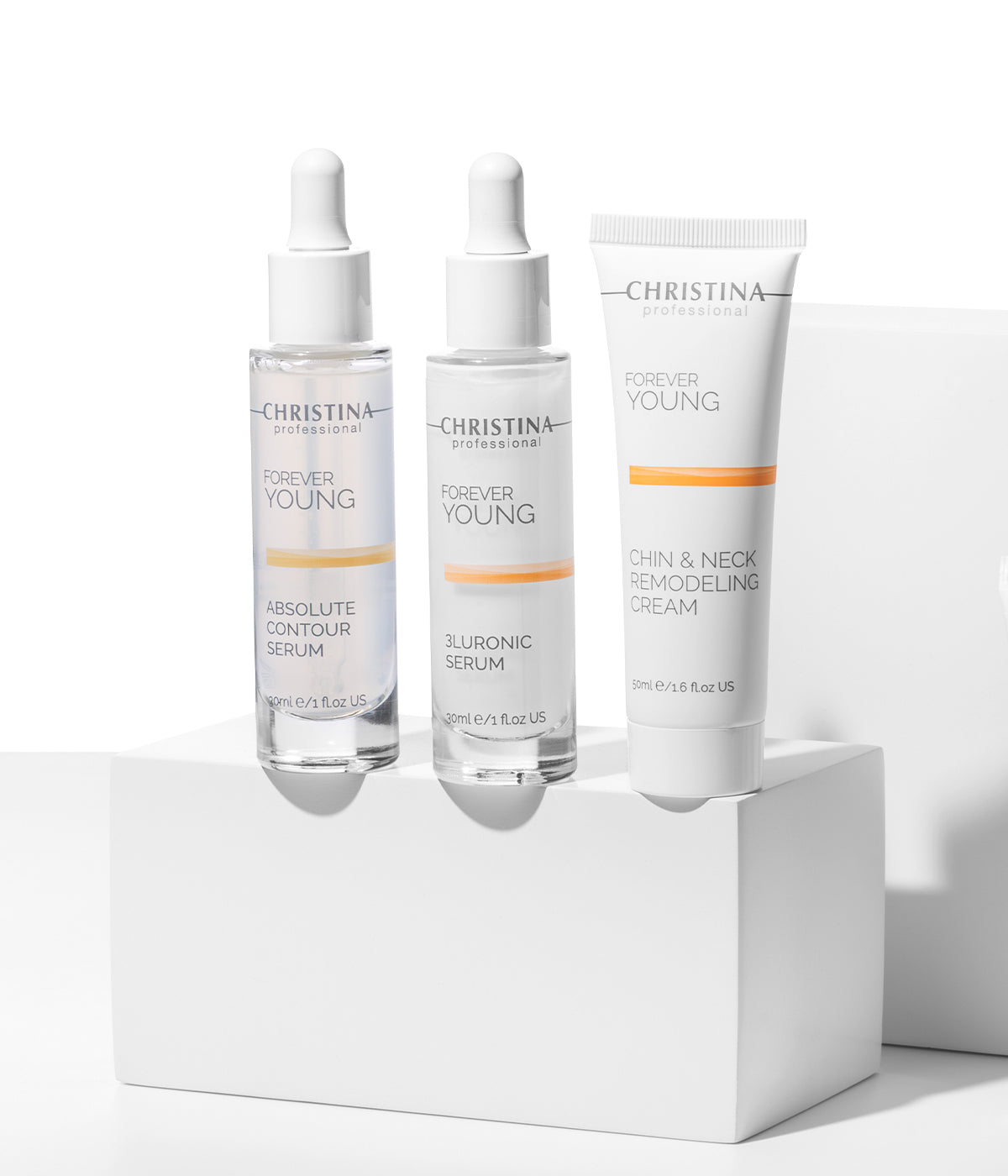 Inzia applicando il 3LURONIC Siero e continua con l’Absolute Contour Siero. Completa la routine di trattamento con l’applicazione della Crema Chin and Neck Remodelling.